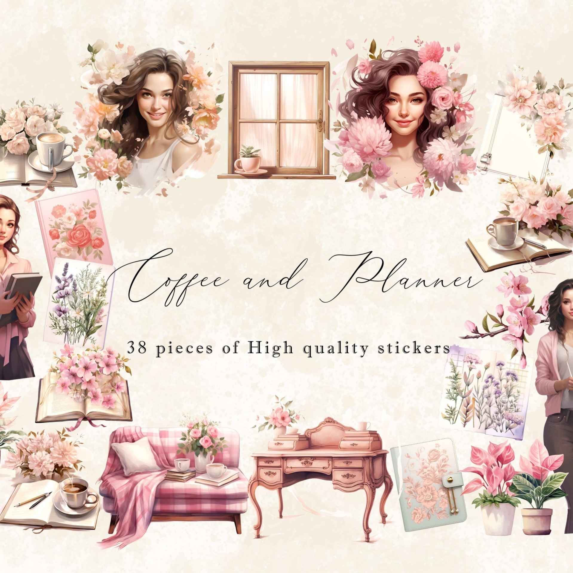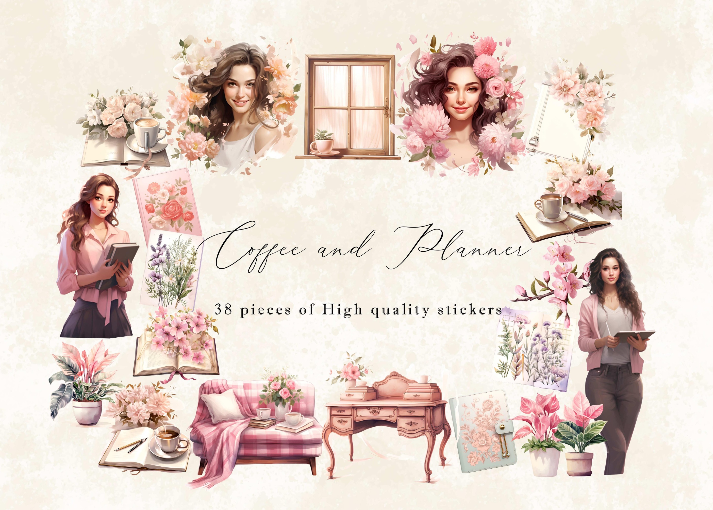 پک استیکر قهوه و برنامه ریزی با تم صورتی