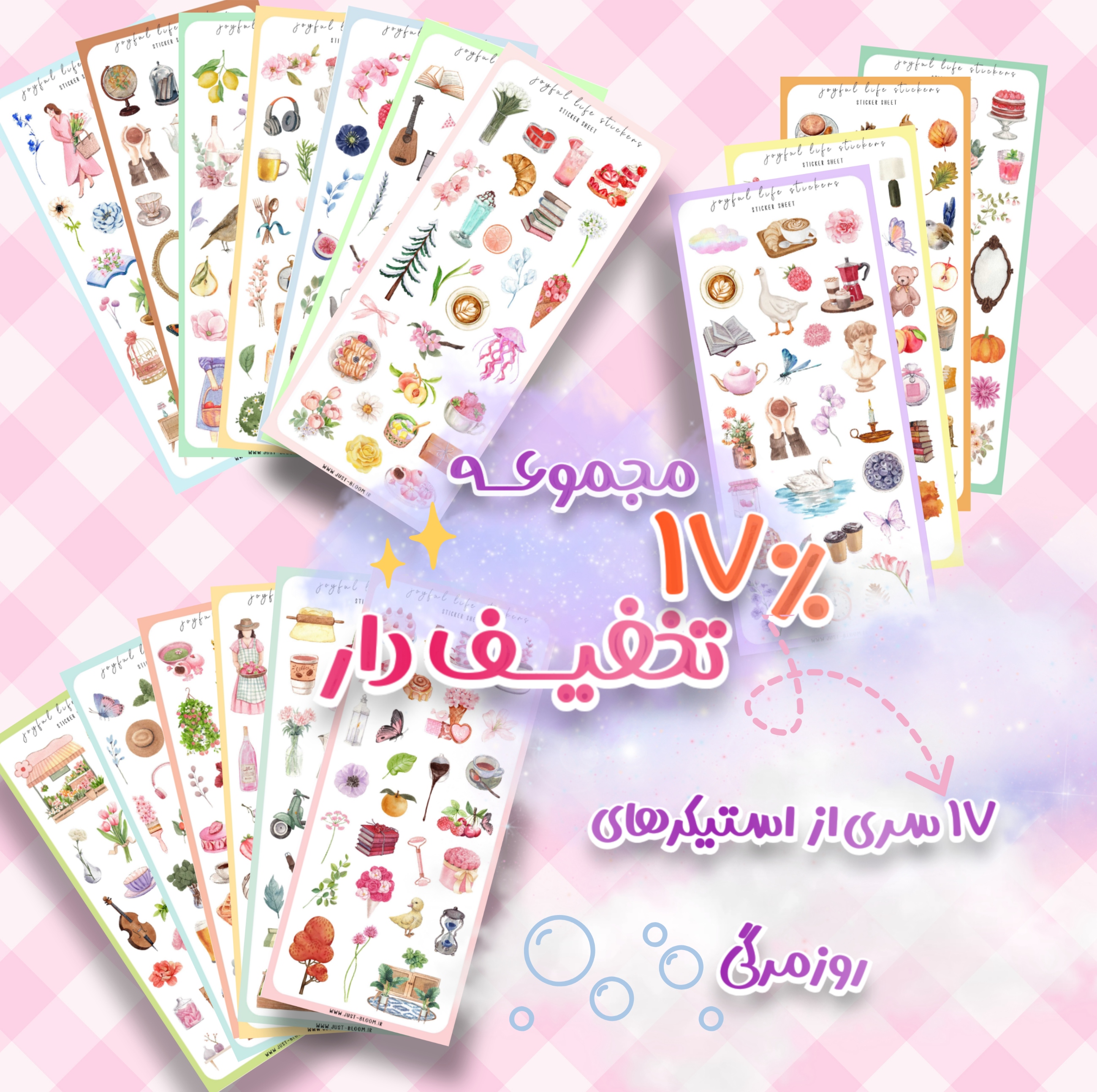 مجوعه 17 برگی از استیکرهای گلاسه با بهترین کیفیت چاپ روی لیبل وارداتی